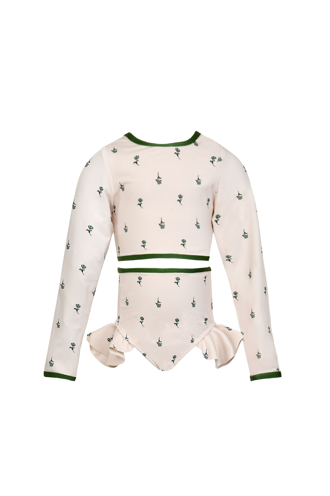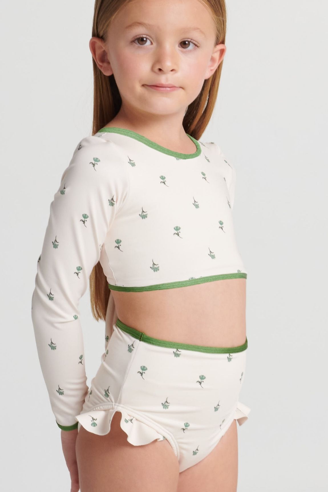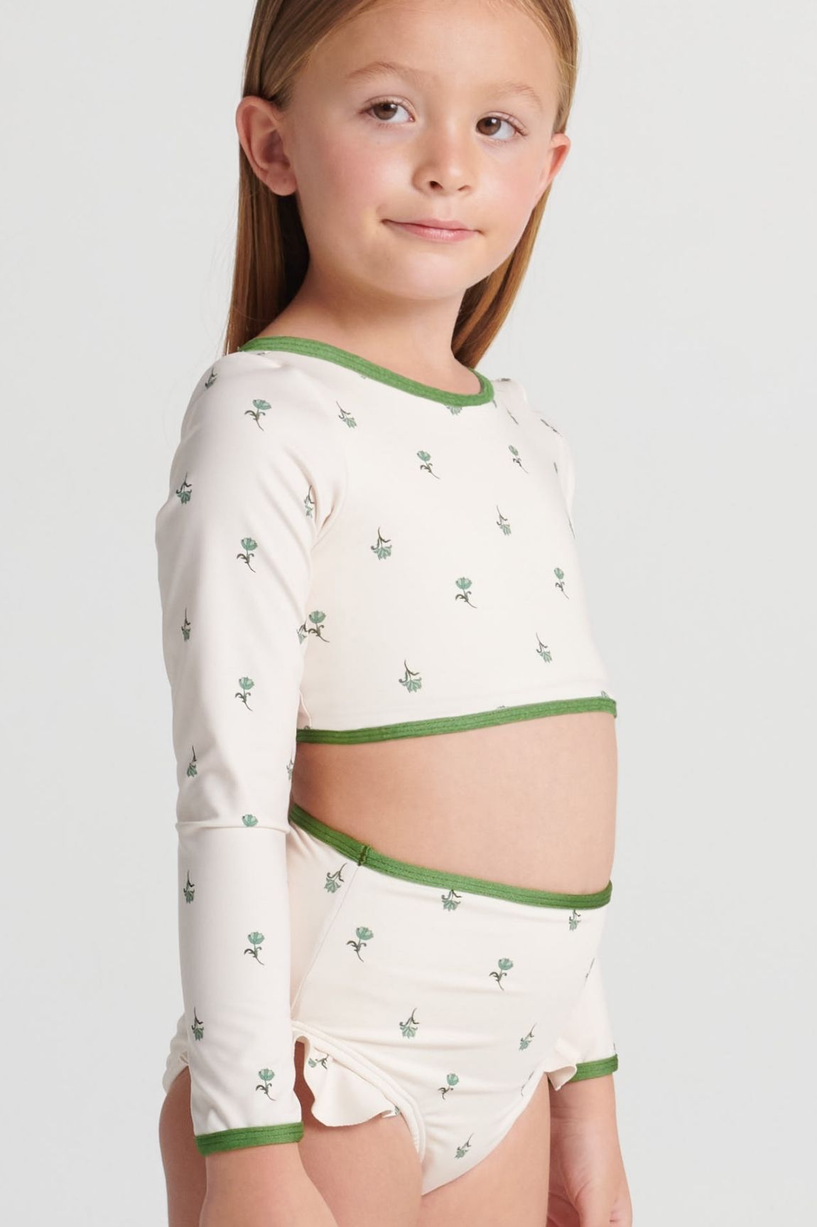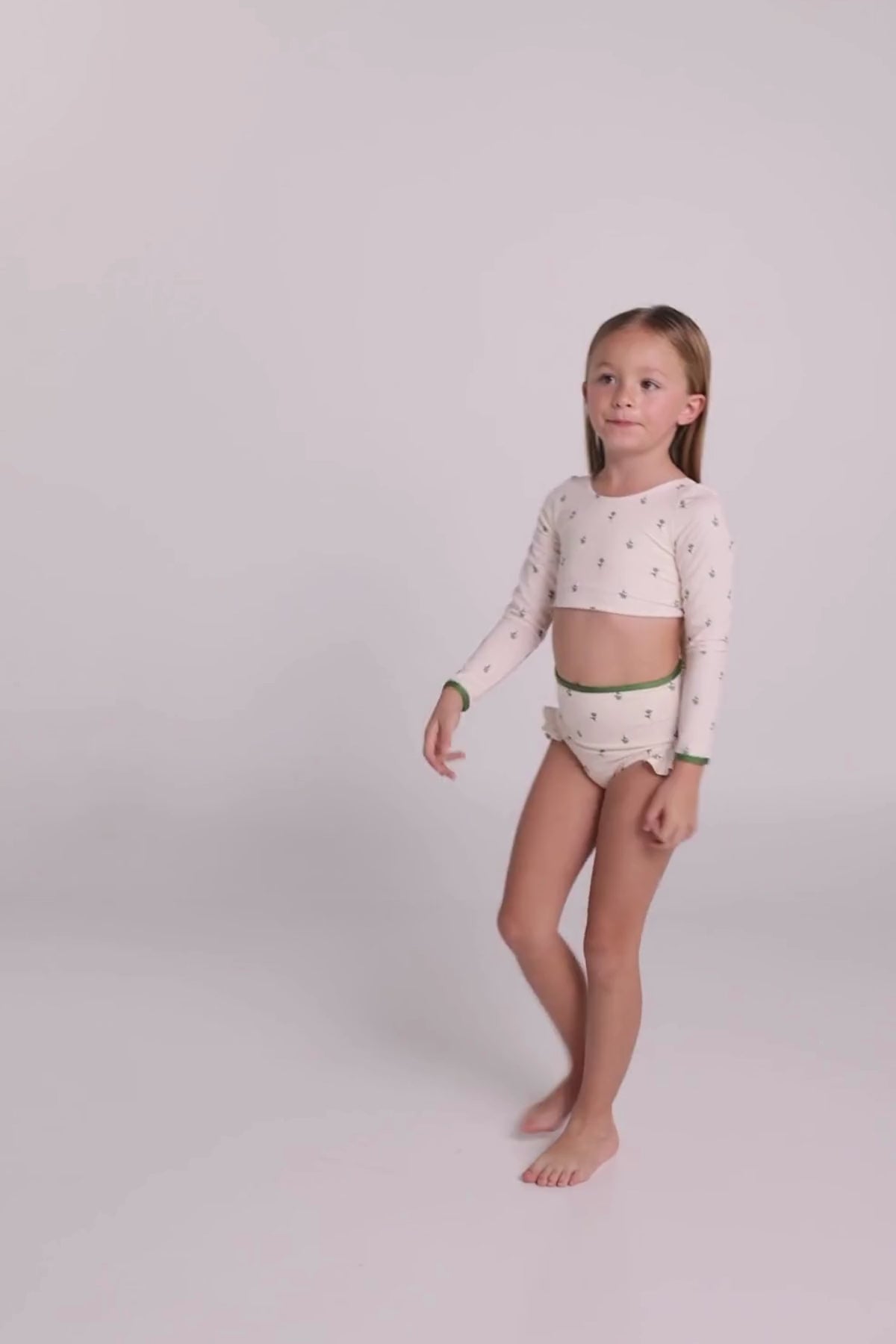 Bikini de niña manga larga con botton alto con arandelas laterales y sesgos en contraste. EKO®FIBERS producida a base de botellas recicladas.