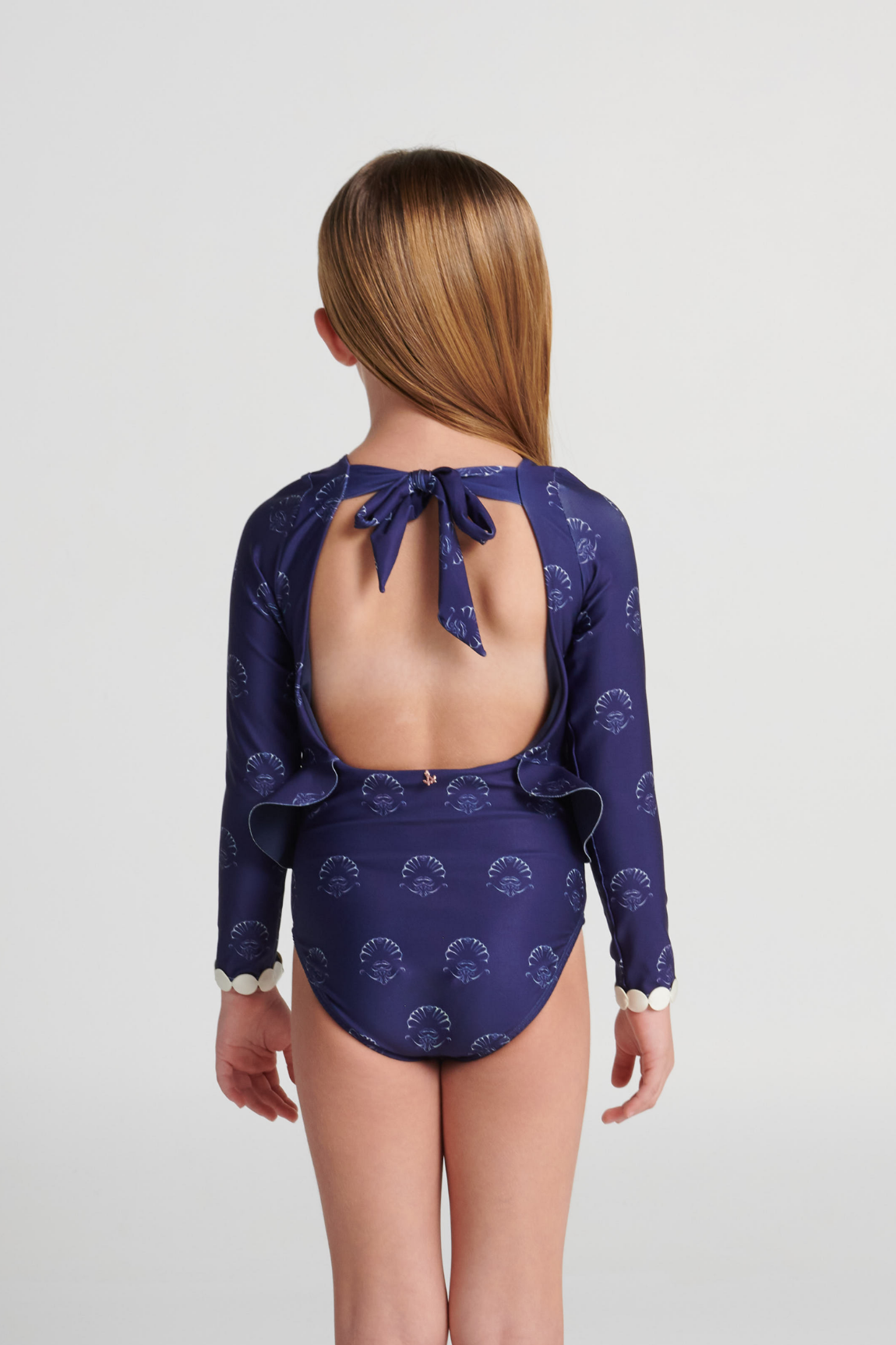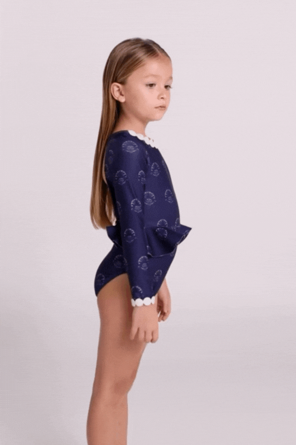 Enterizo de niña con boleros decorativos en los costados, moras decorativas en el escote delantero y mangas. EKO®FIBERS producida a base de botellas recicladas.