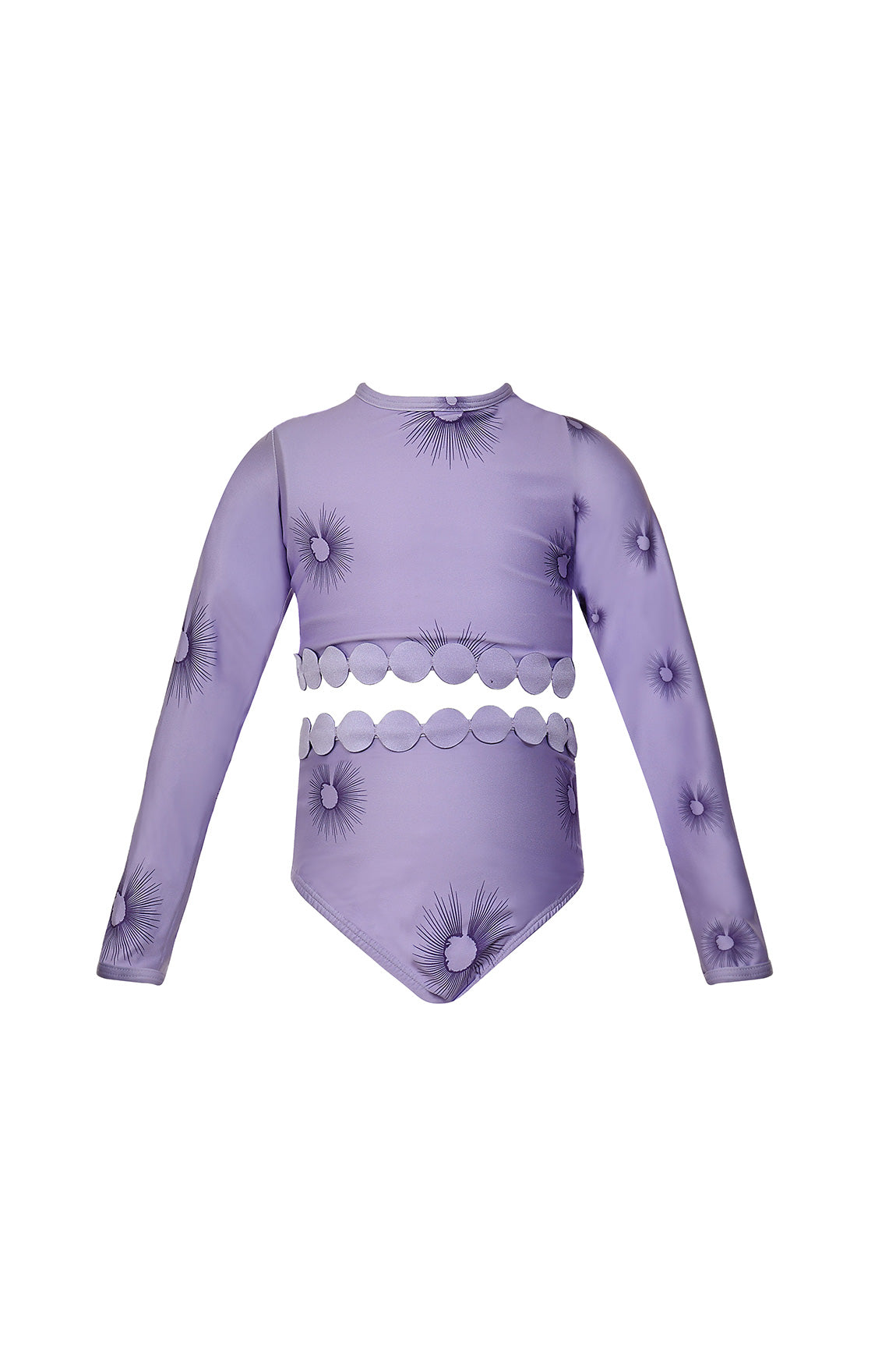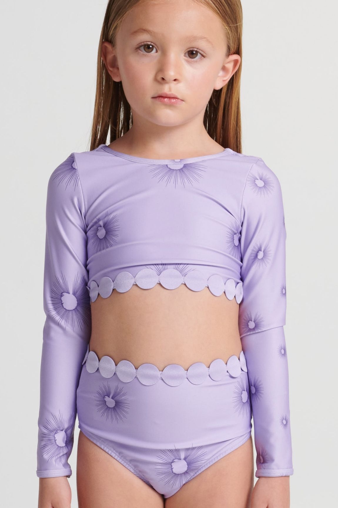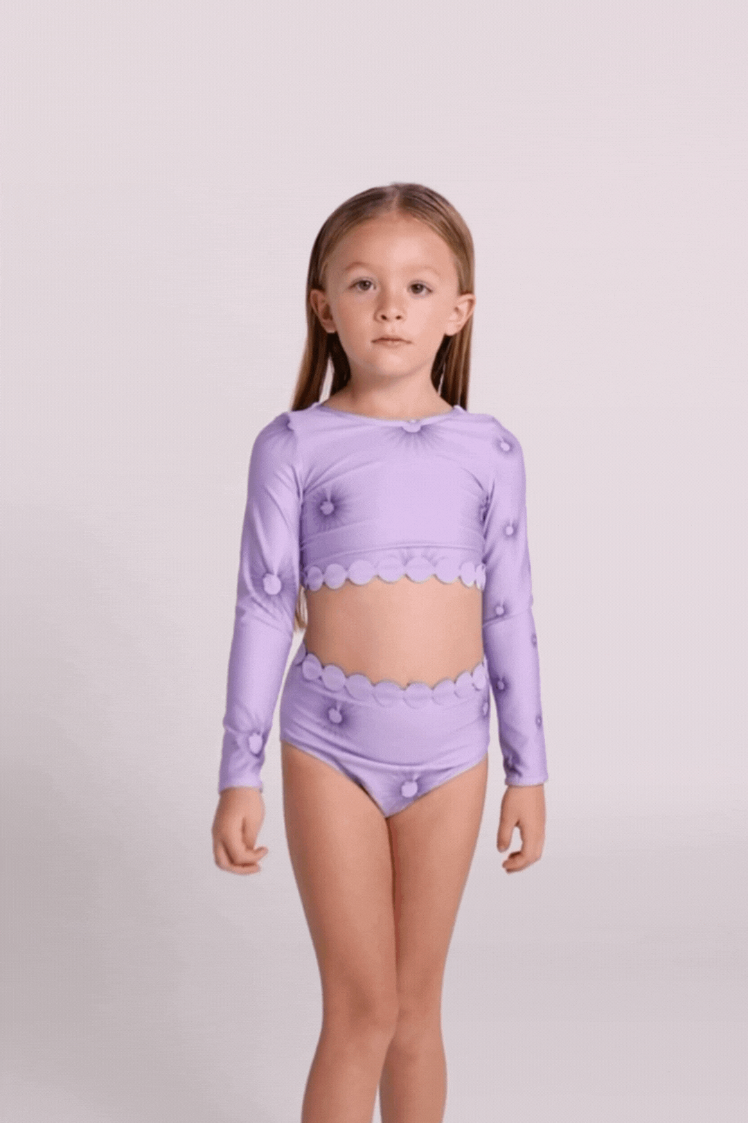Bikini de niña con top de manga larga, detalles laminados con corte láser y ajuste en la espalda. Panty de cintura alta con detalles laminados de corte láser en la cadera.