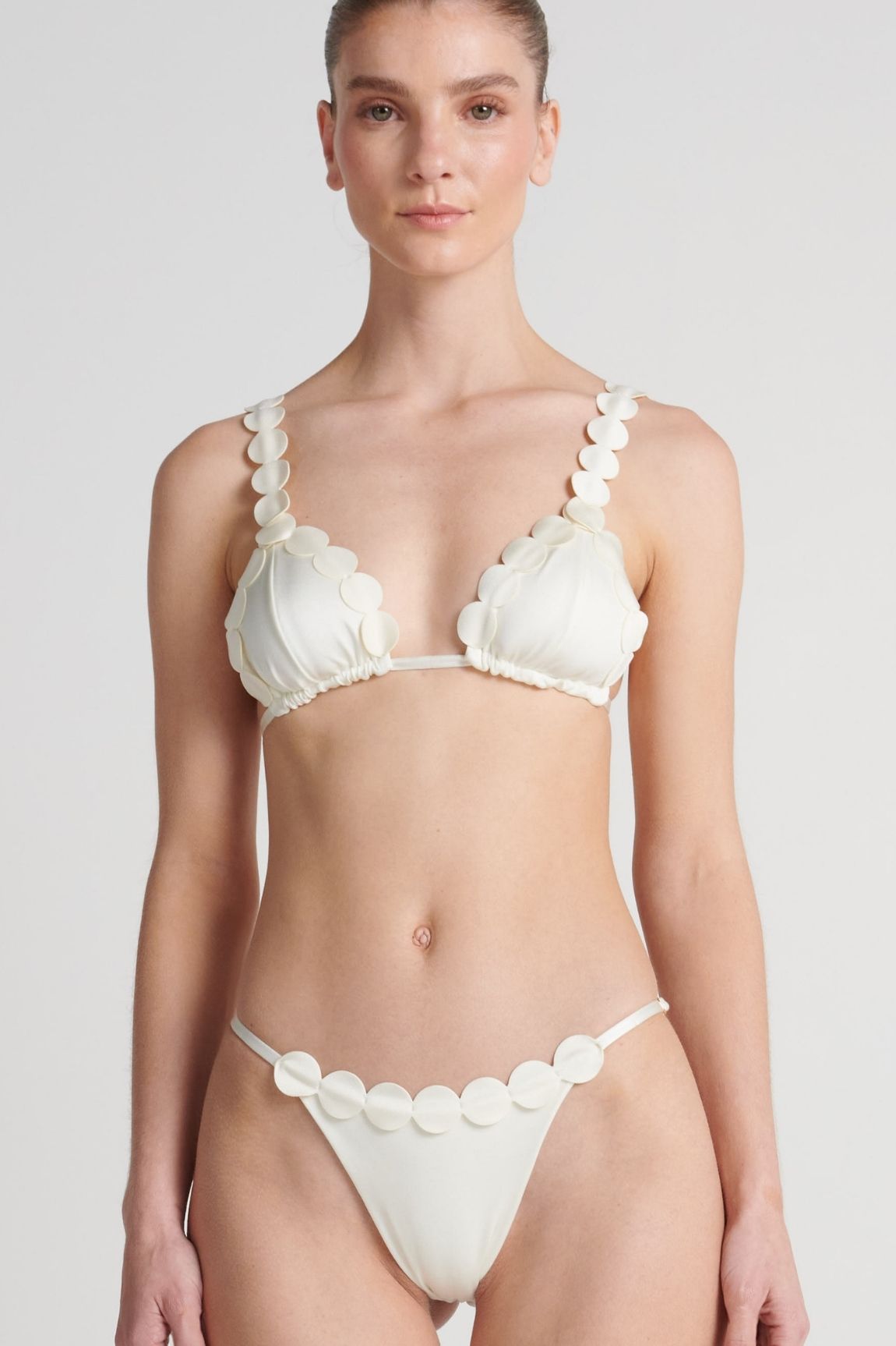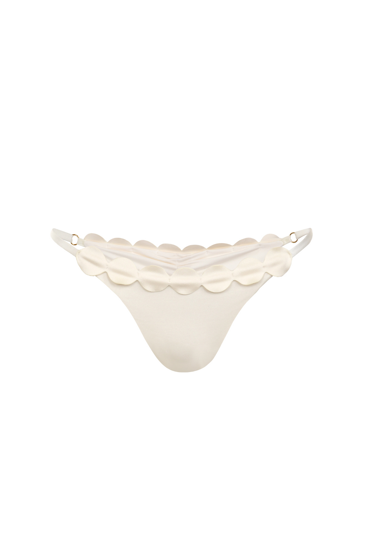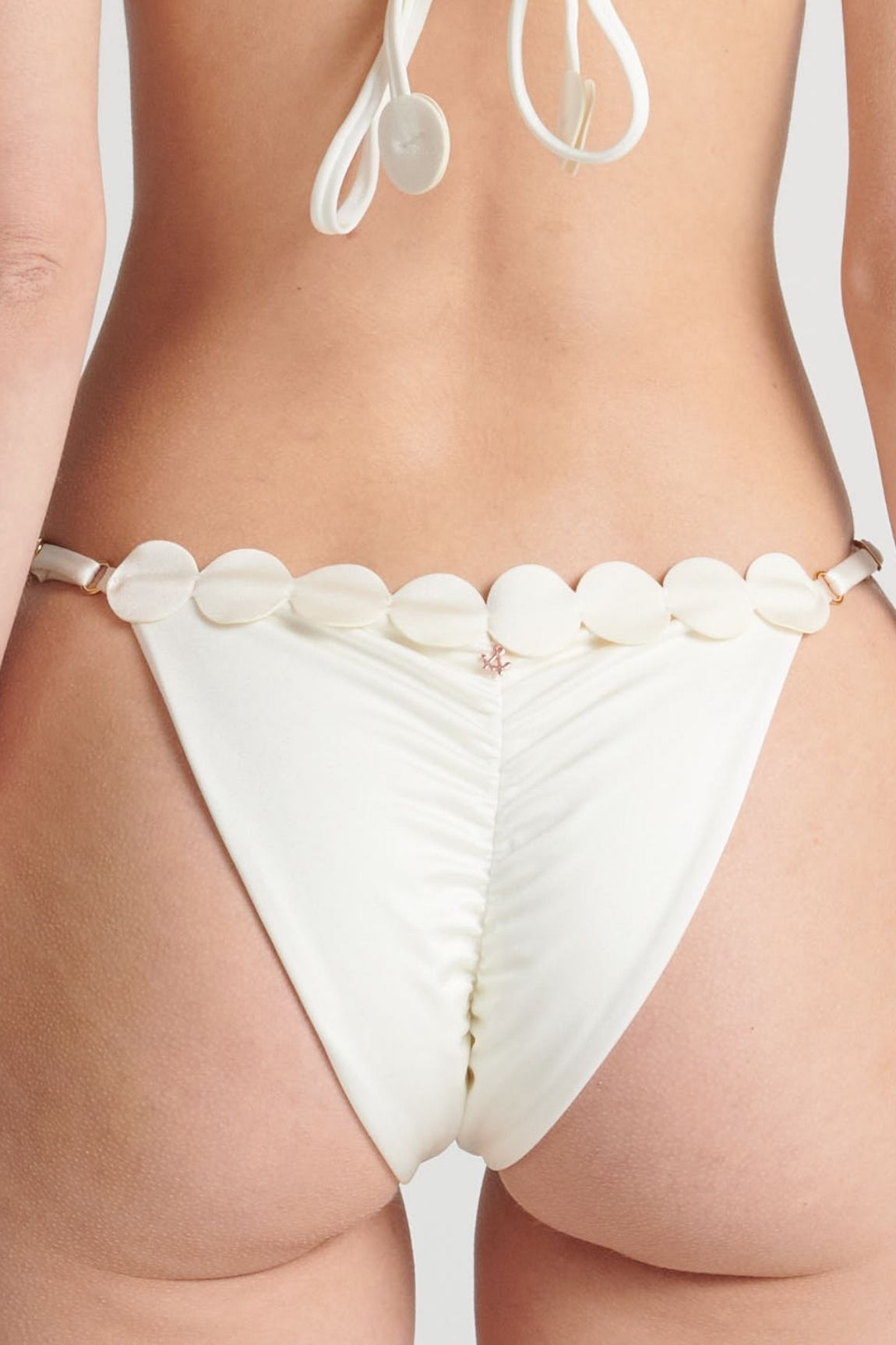 Bottom con detalles de moras alrededor de la parte superior cortadas a láser, tensores graduable en los costados en acabado en baño de oro, y fruncido en la parte posterior. EKO®FIBERS producida a base de botellas recicladas.