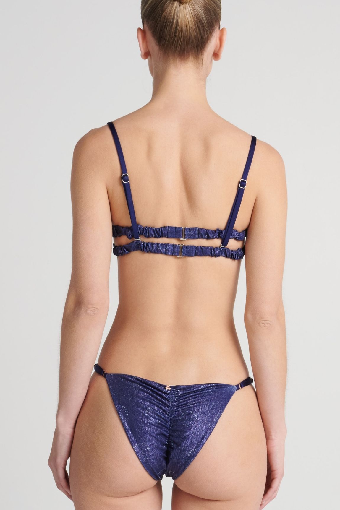 Bottom con tensores graduables en los costados en acabado en baño de oro, y fruncido en la parte posterior. EKO®FIBERS producida a base de botellas recicladas.