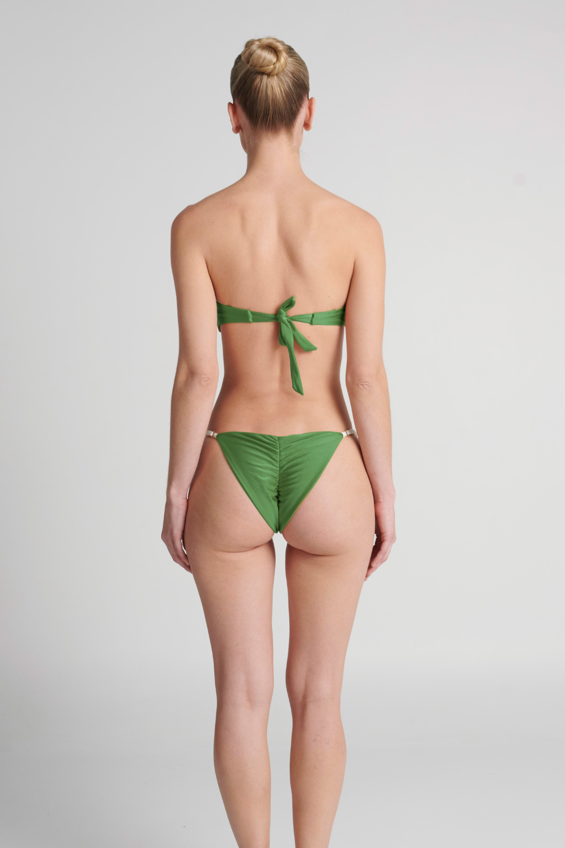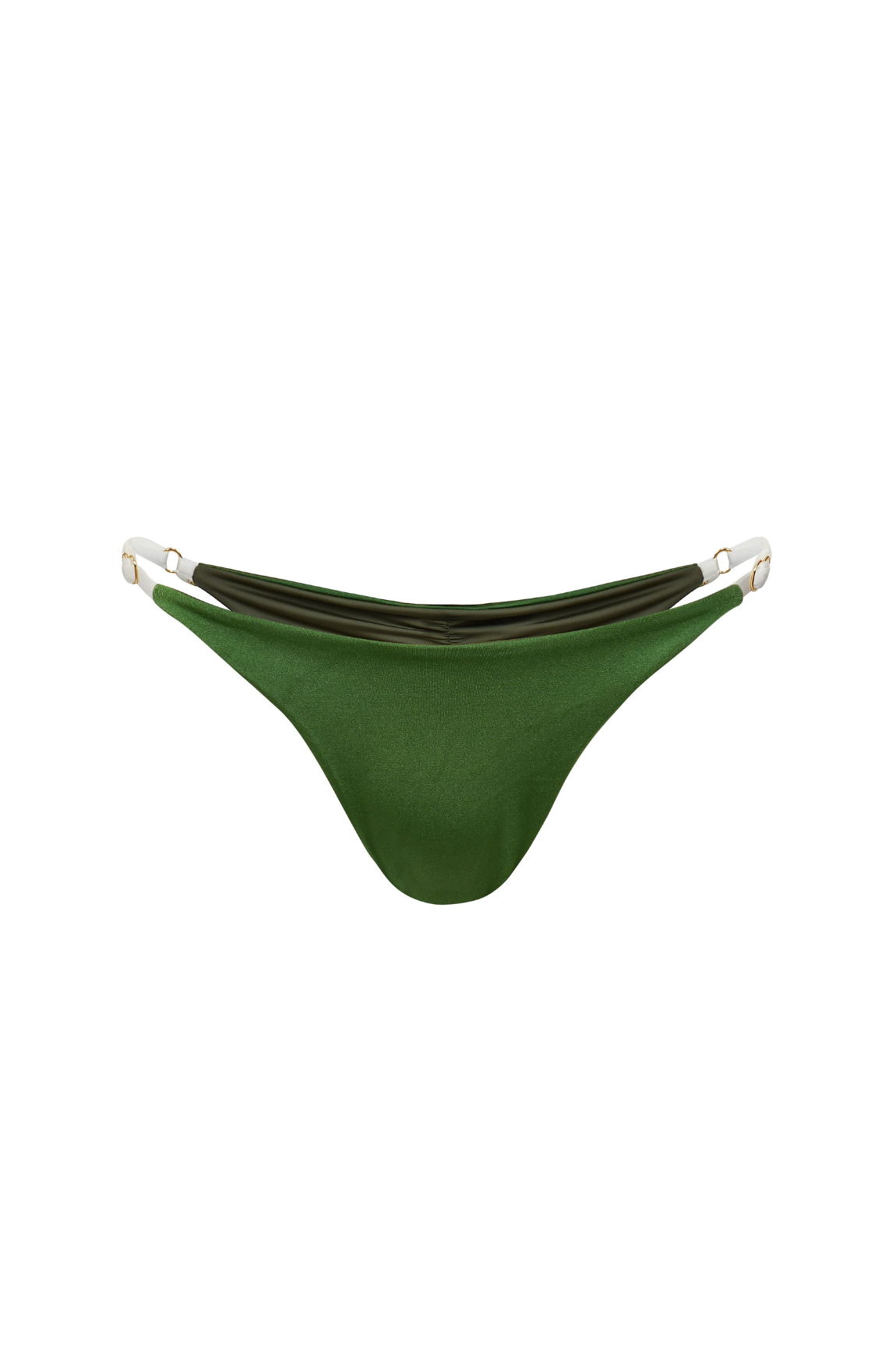 Bottom con tensores graduables en los costados en acabado en baño de oro, y fruncido en la parte posterior. EKO®FIBERS producida a base de botellas recicladas.