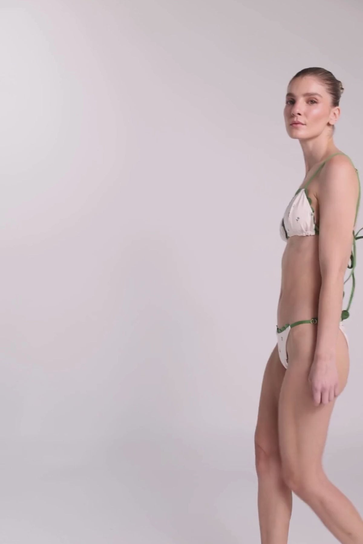 Bottom con detalles de moras alrededor de la parte superior cortadas a láser, tensores graduables en los costados en acabado en baño de oro, y fruncido en la parte posterior. EKO®FIBERS producida a base de botellas recicladas.