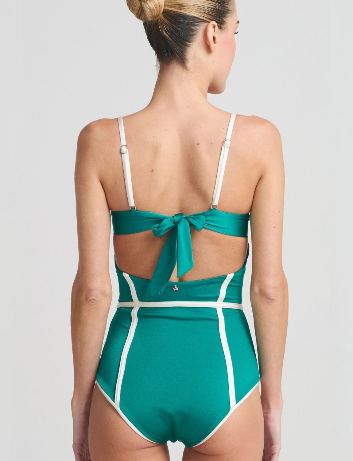 Enterizo con copa fija y silueta icónica de Ancora. Cuenta con sesgos estratégicamente ubicados que estilizan la figura, tirantes ajustables con tensores en acabado de baño de oro.