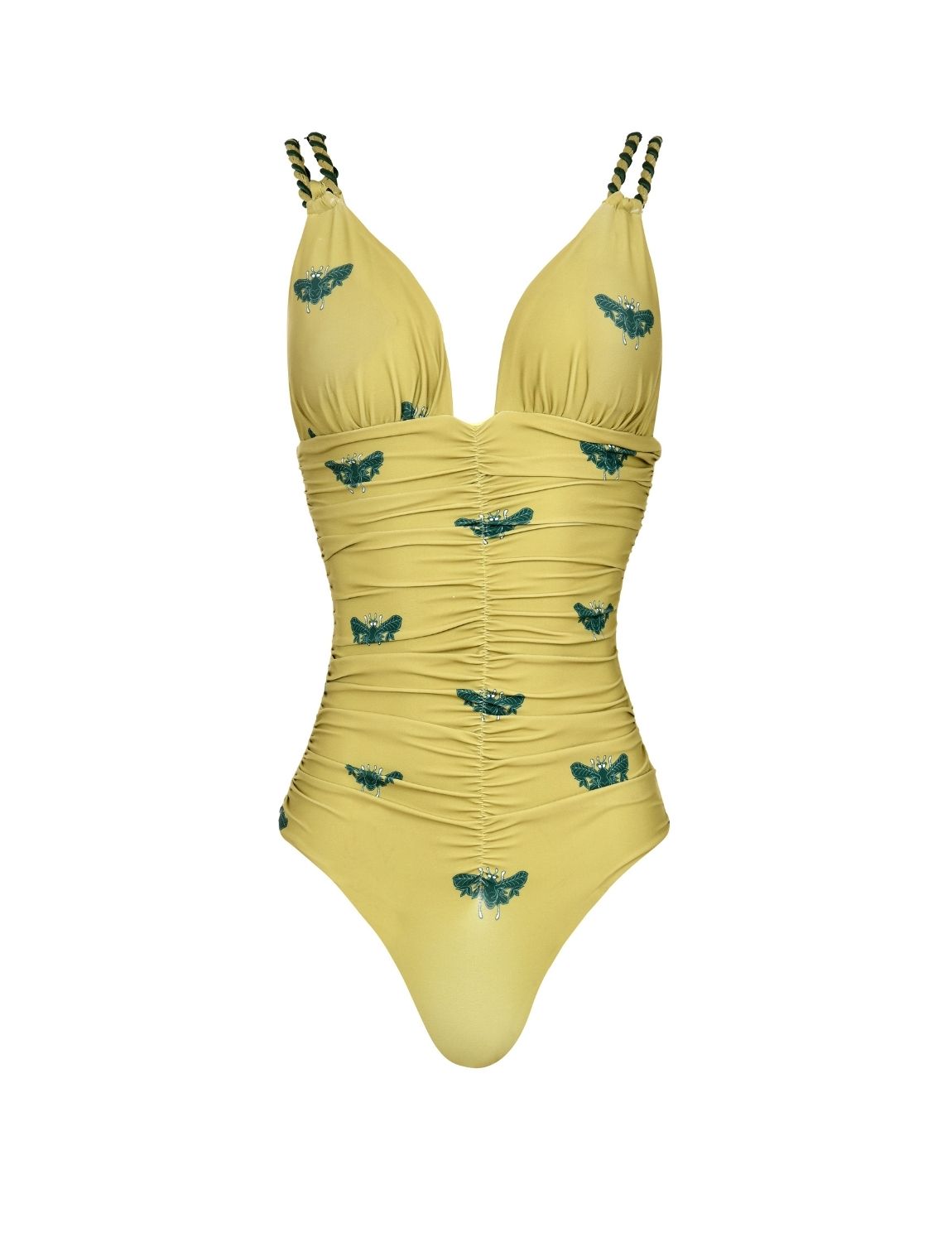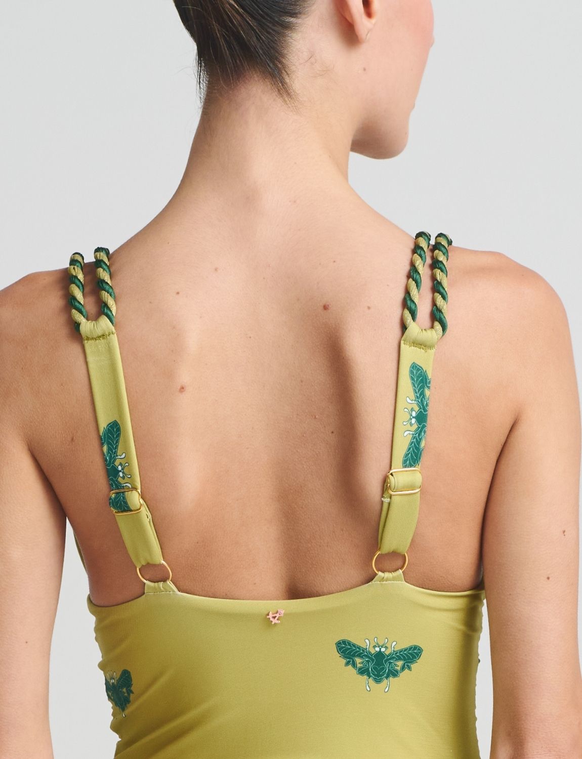 Enterizo con corte debajo del busto y fruncido central, con delicadas tiras trenzadas a mano, ajustables mediante tensores en acabado de baño de oro.