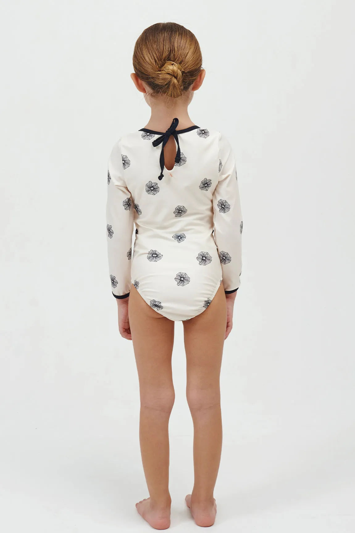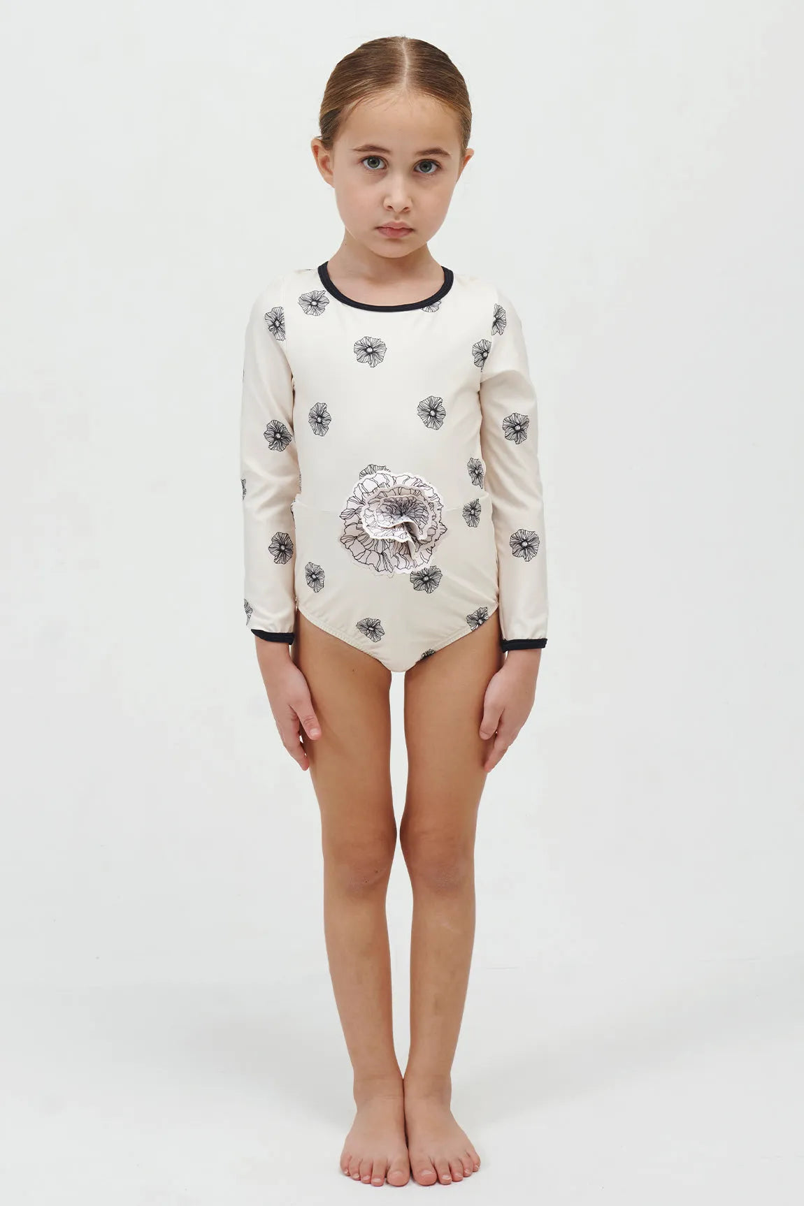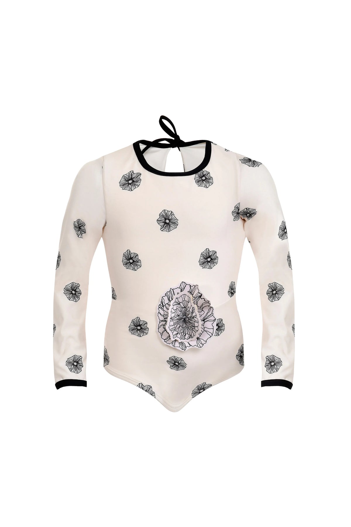 Enterizo manga larga con corte en cintura y detalle decorativo de flor.