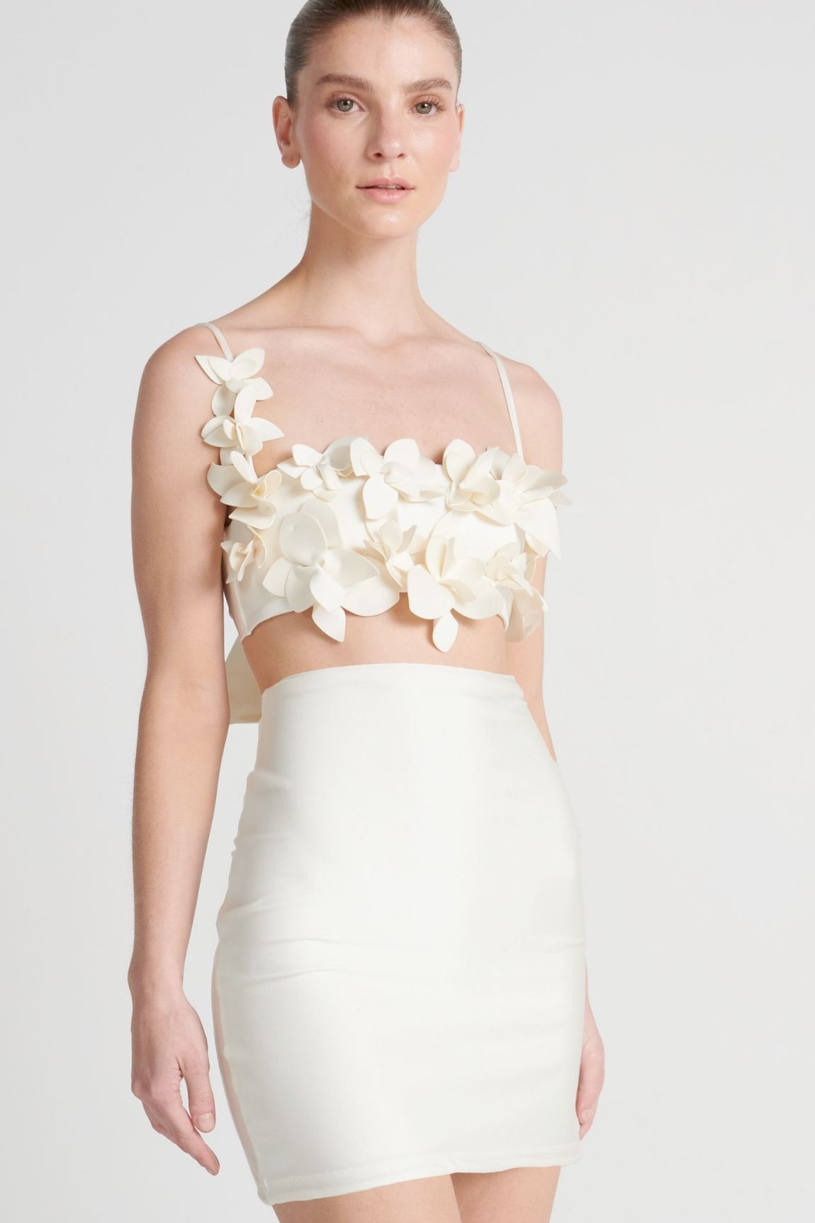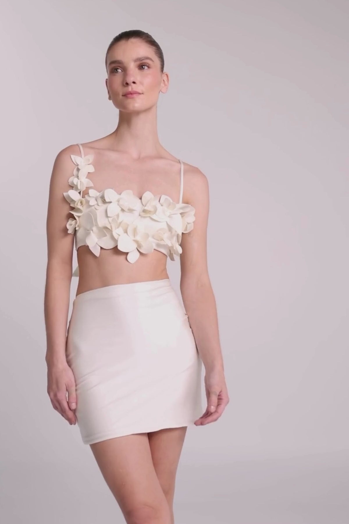 Falda corta en licra de tiro alto, silueta ajustada a la figura.