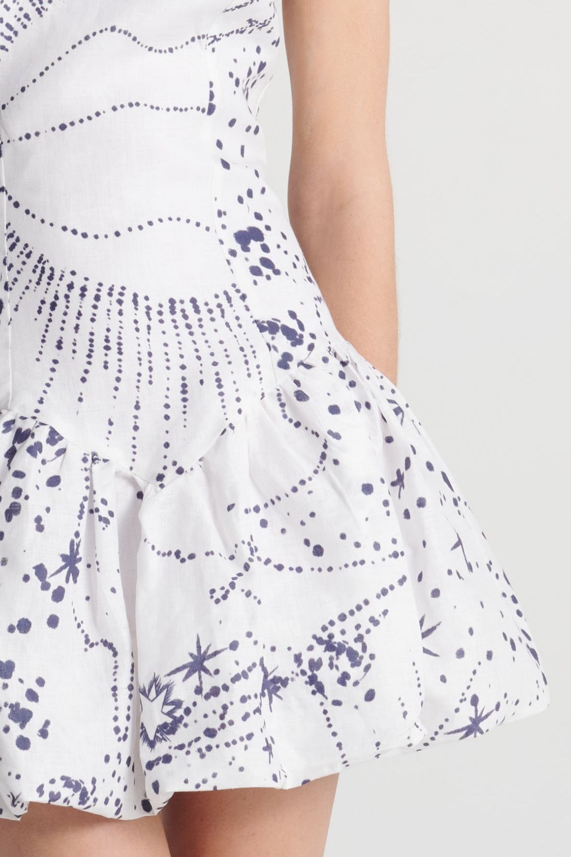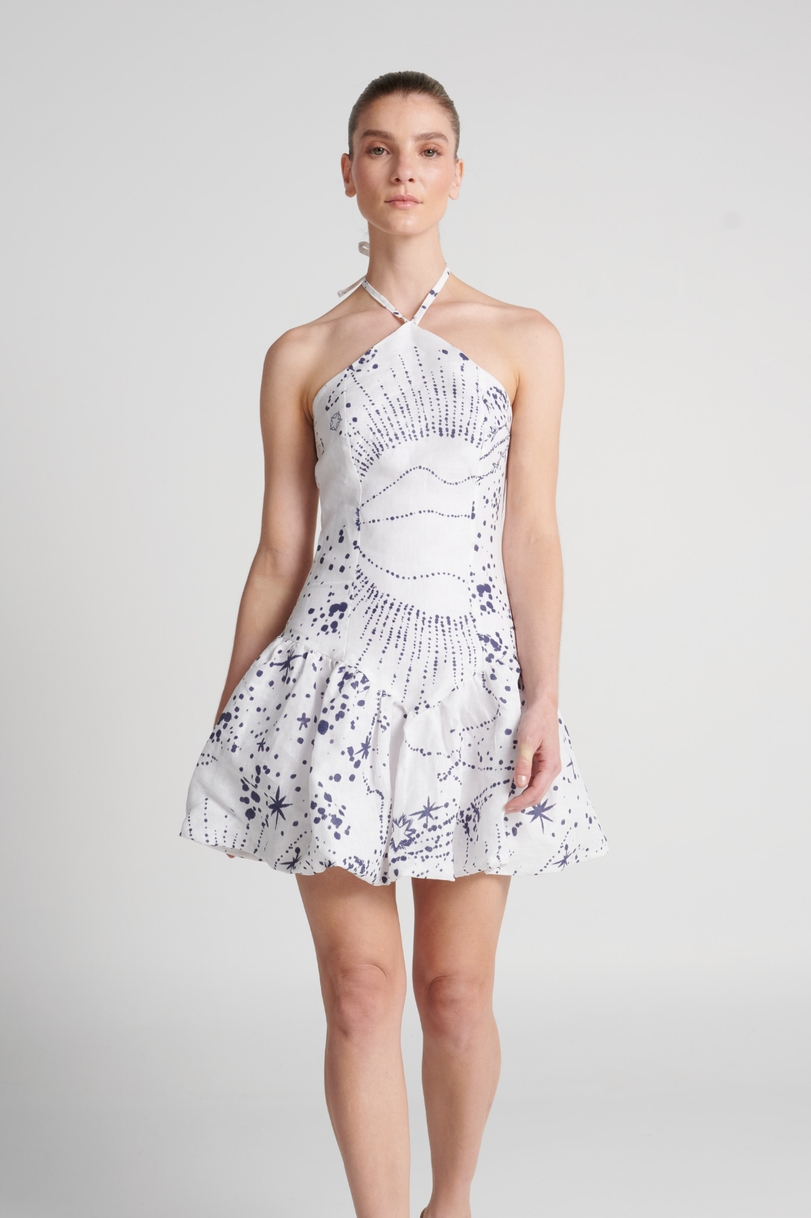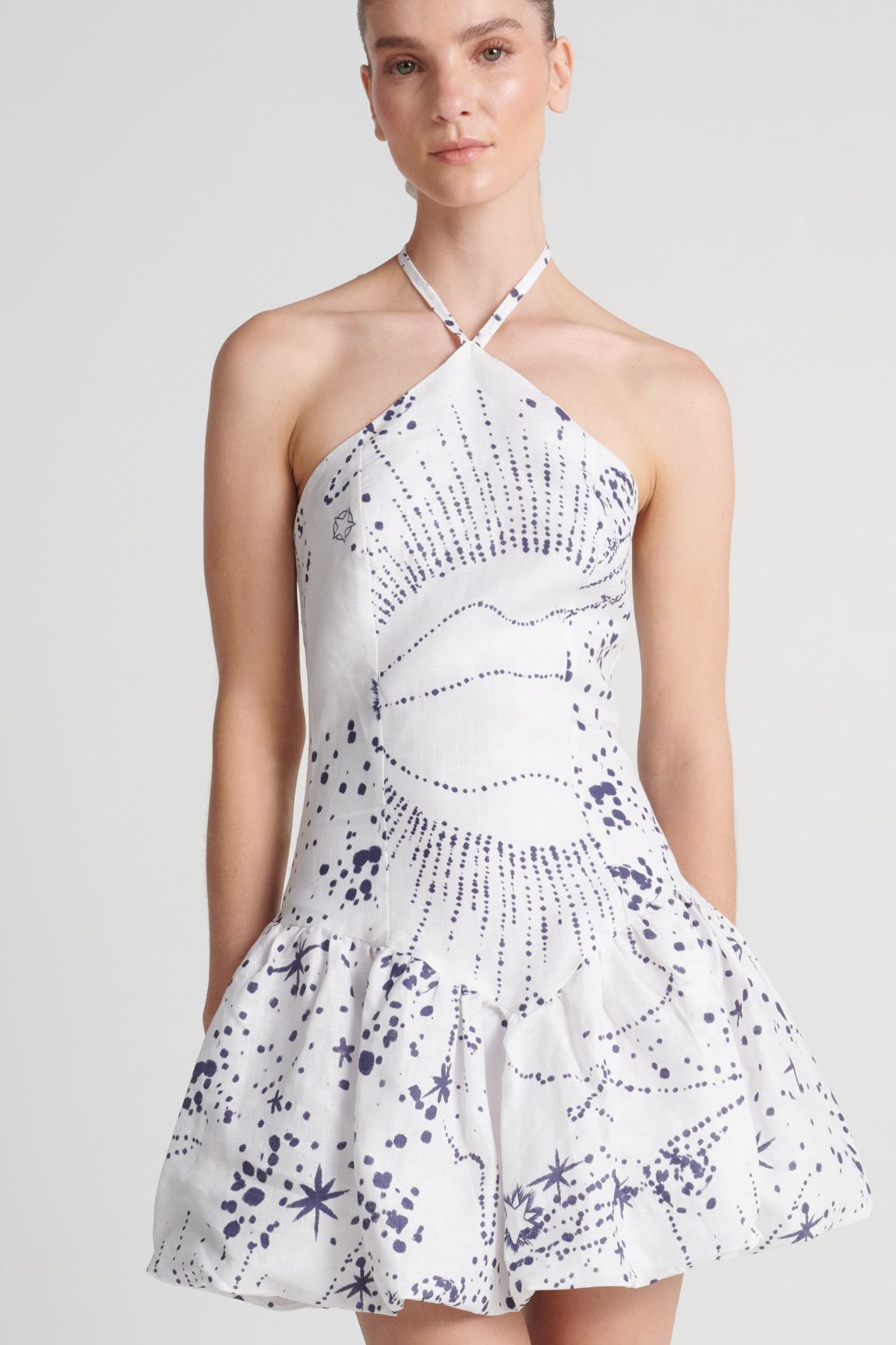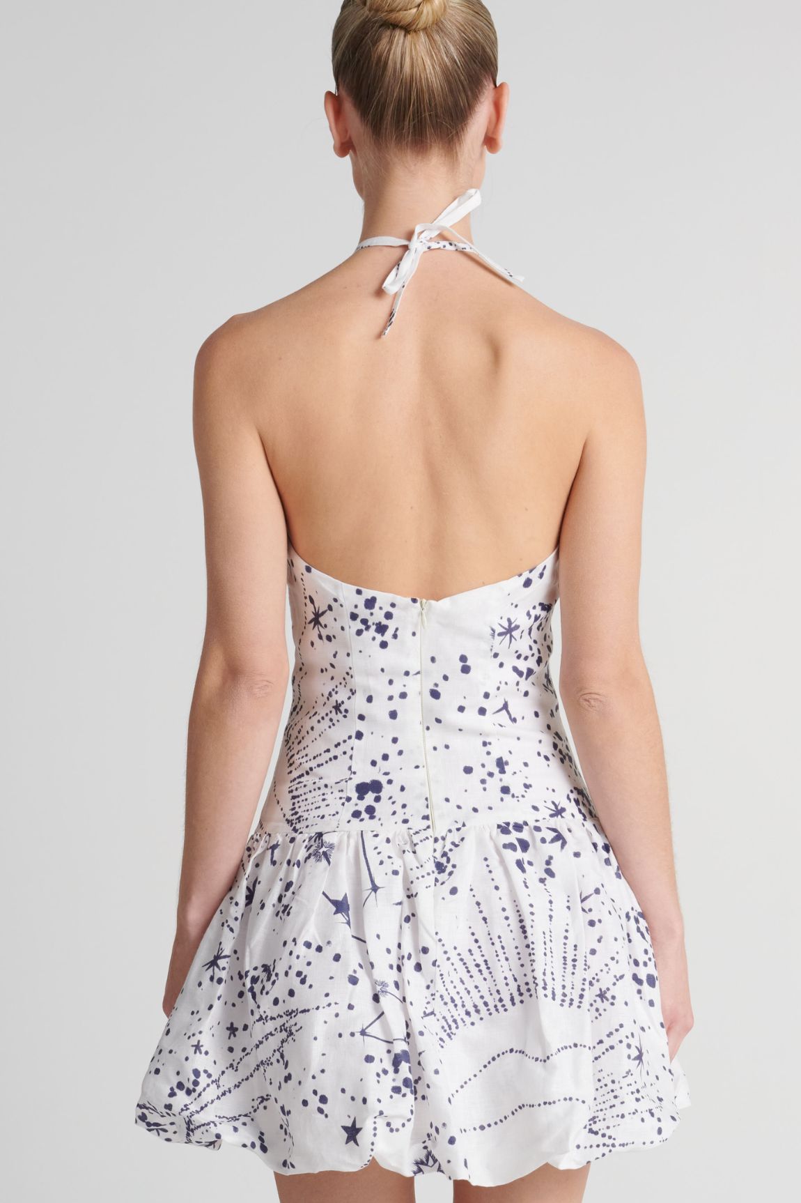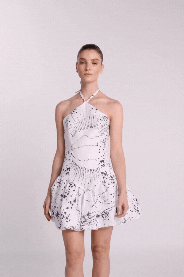 Vestido con amarre al cuello y corte a la altura de la cadera. Incluye cremallera invisible en la espalda para un acabado limpio. La falda presenta un volumen tipo globo.