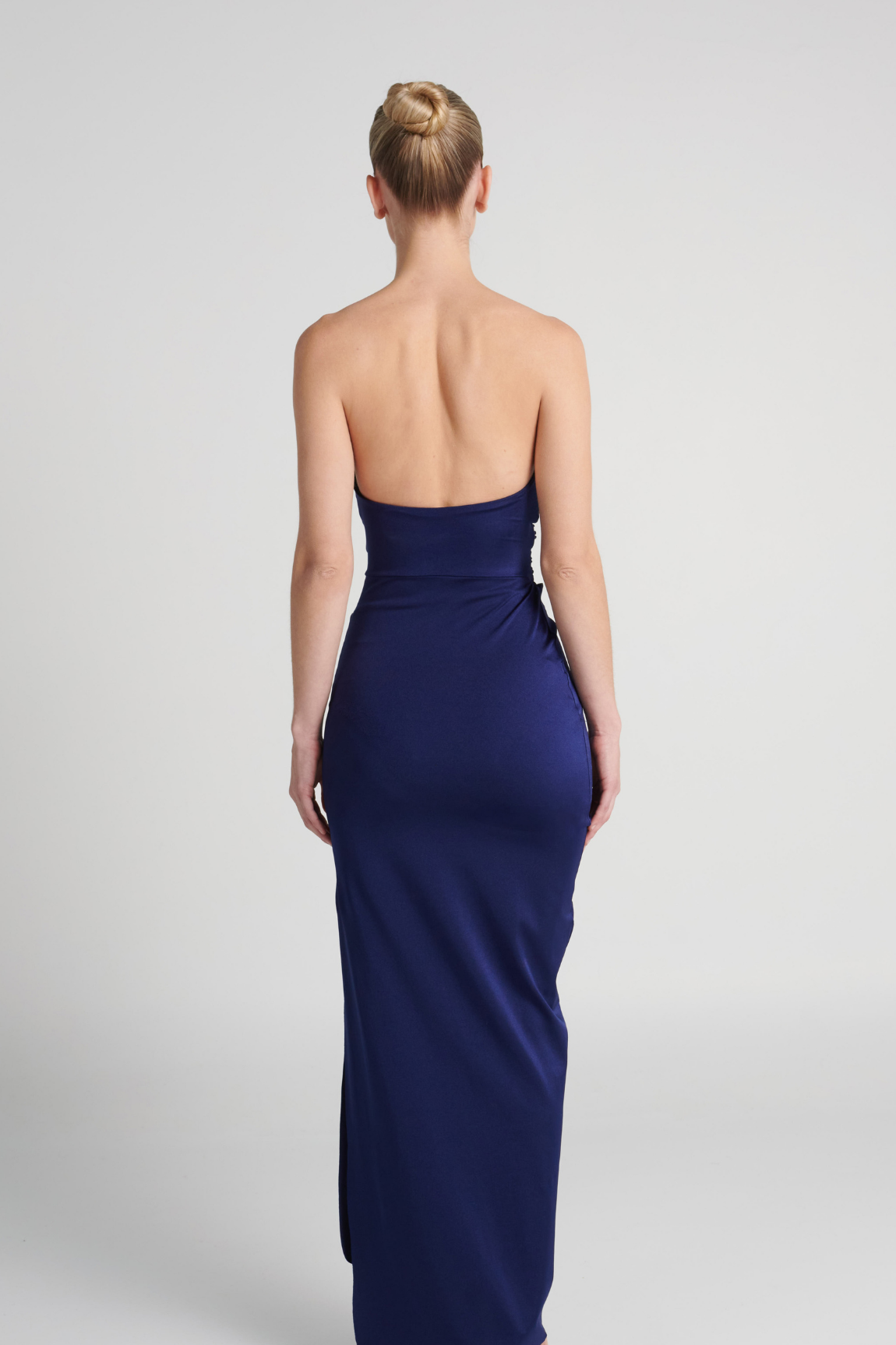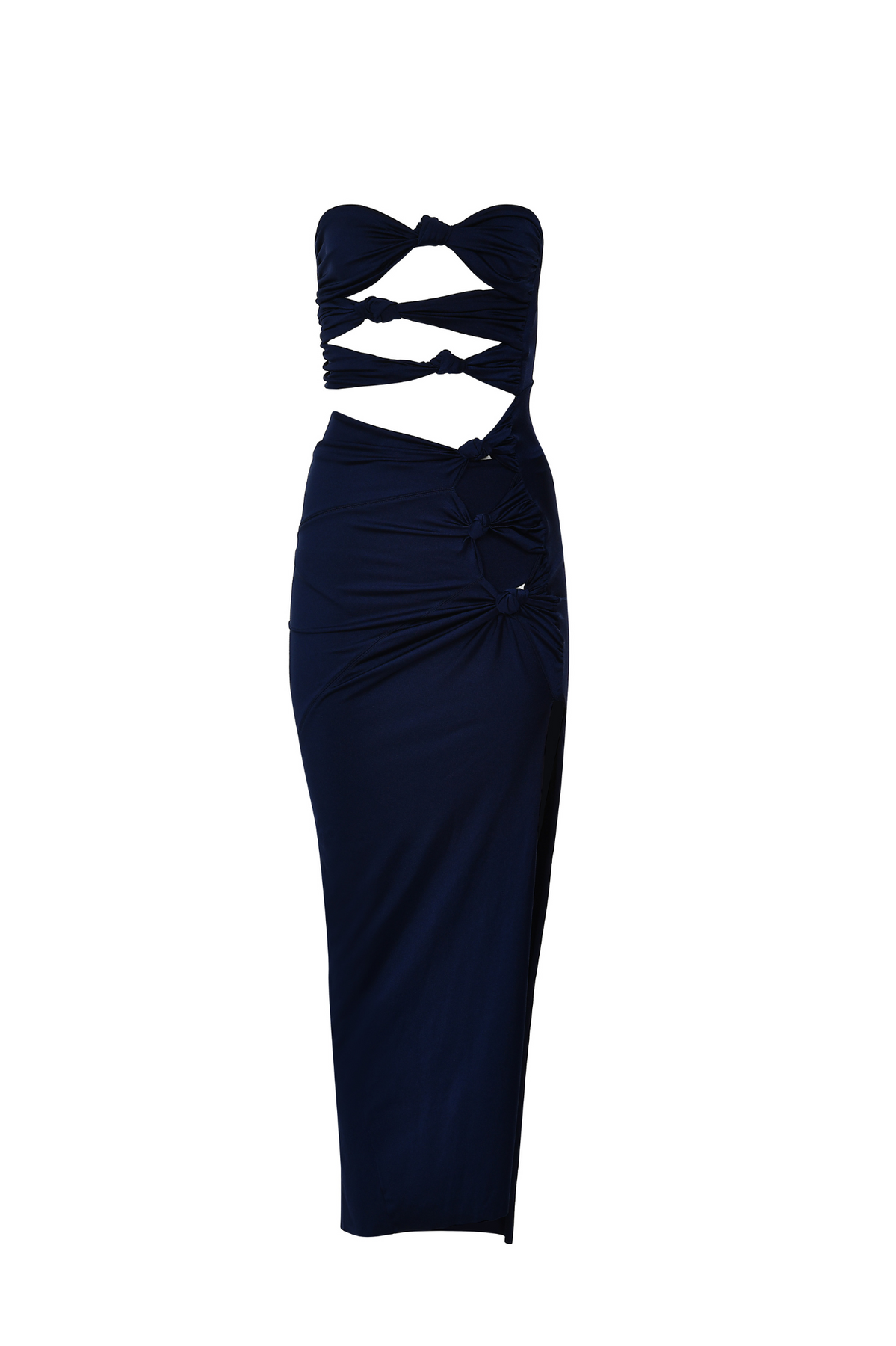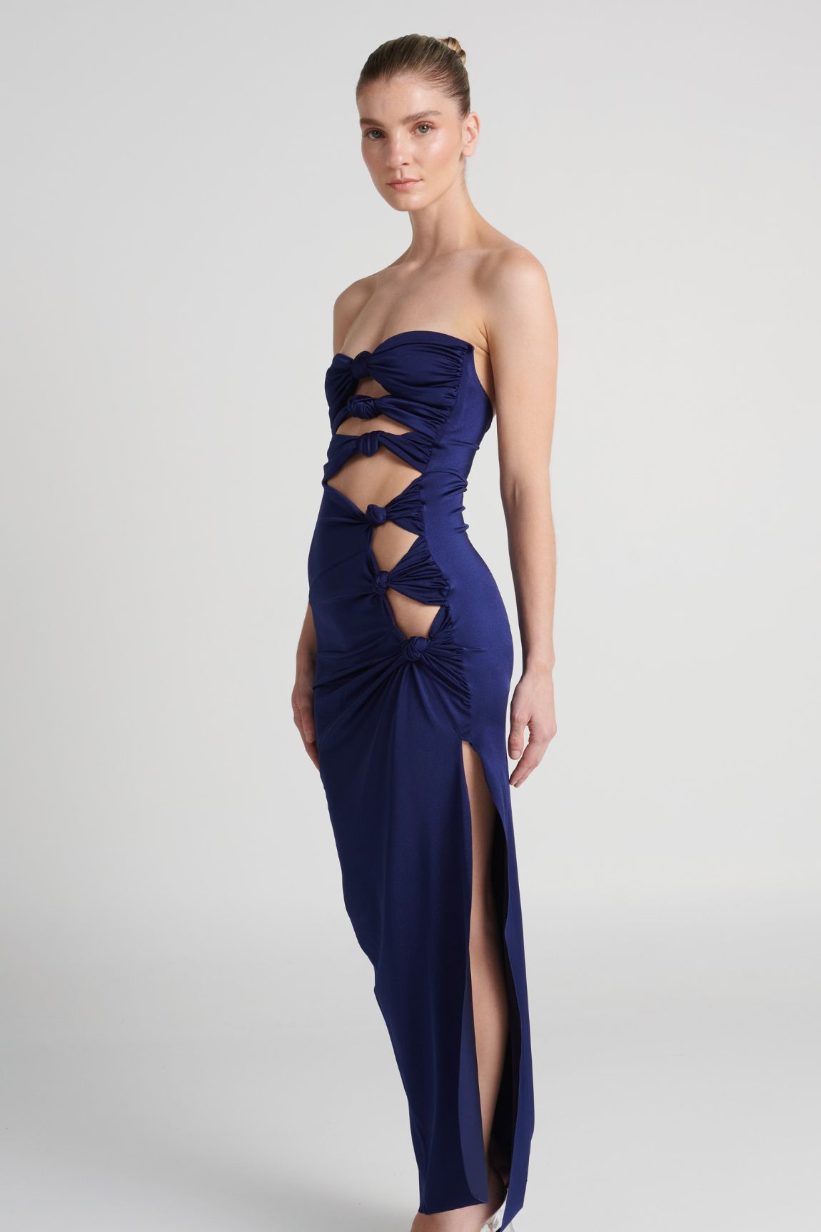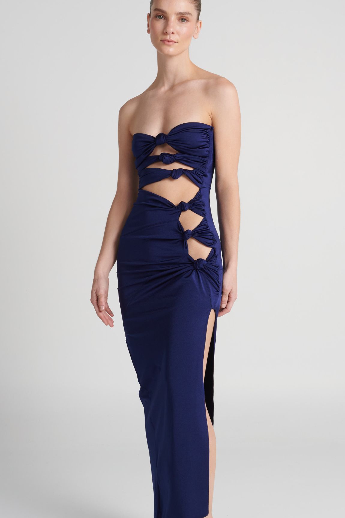 Vestido drapeado con nudos asimétricos y abertura en la pierna. Tirantes ajustables y varillas laterales en el busto para un soporte adicional.