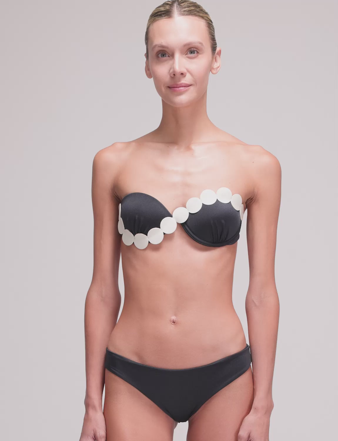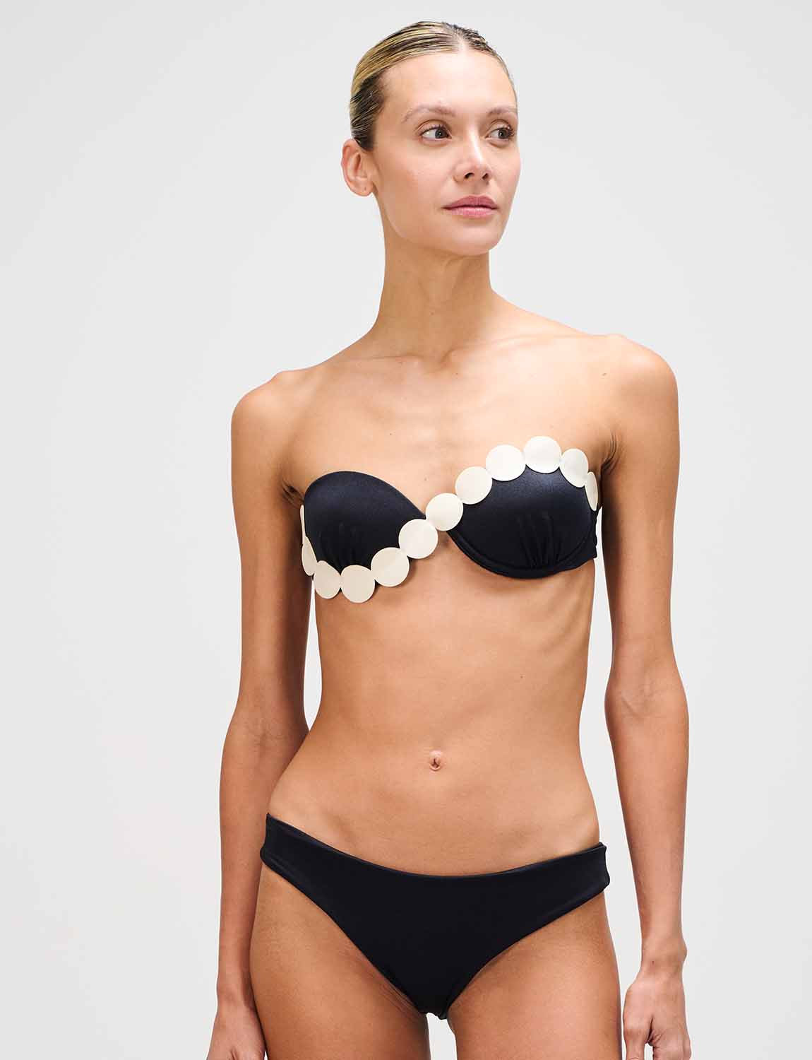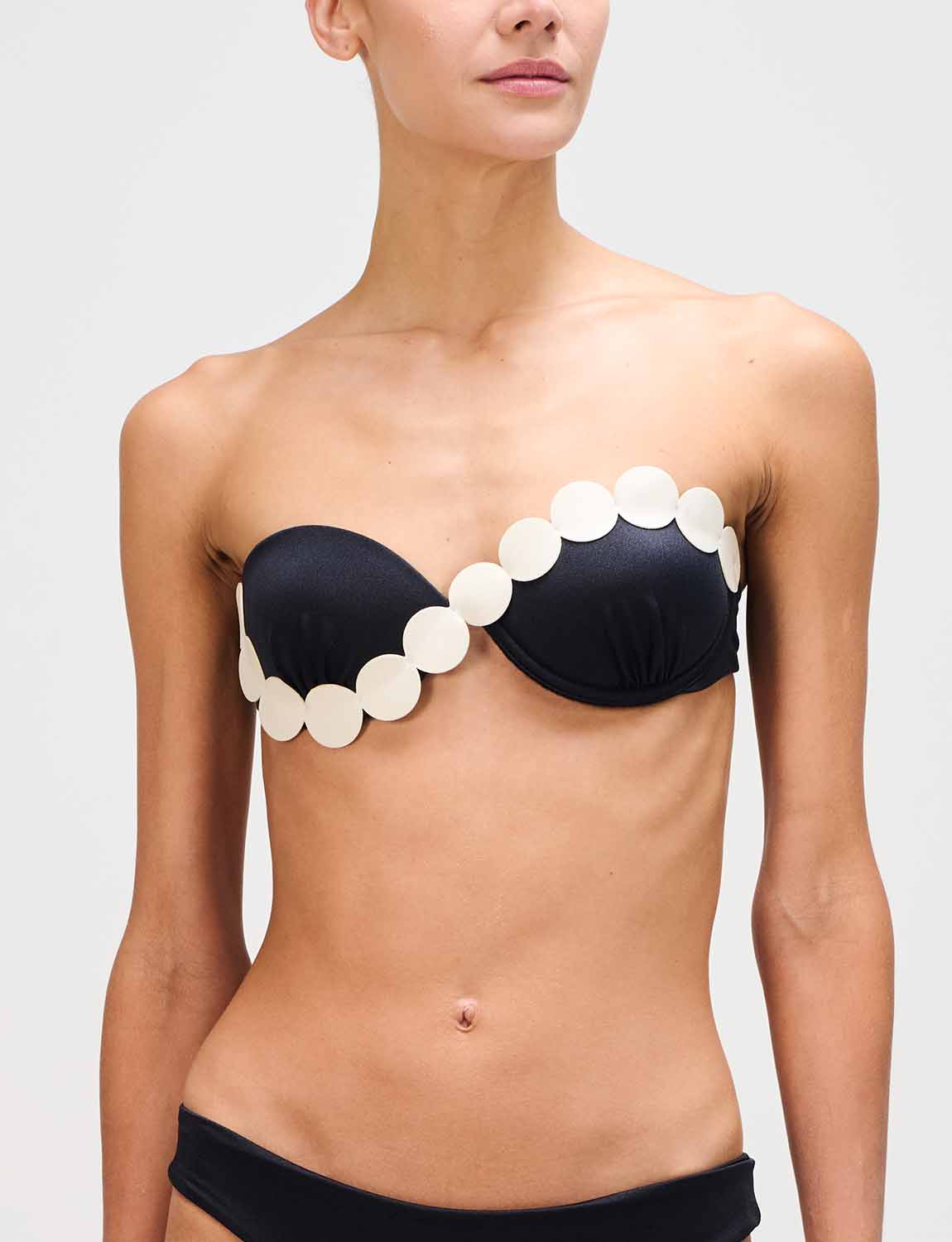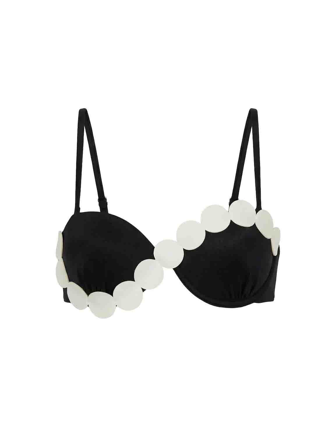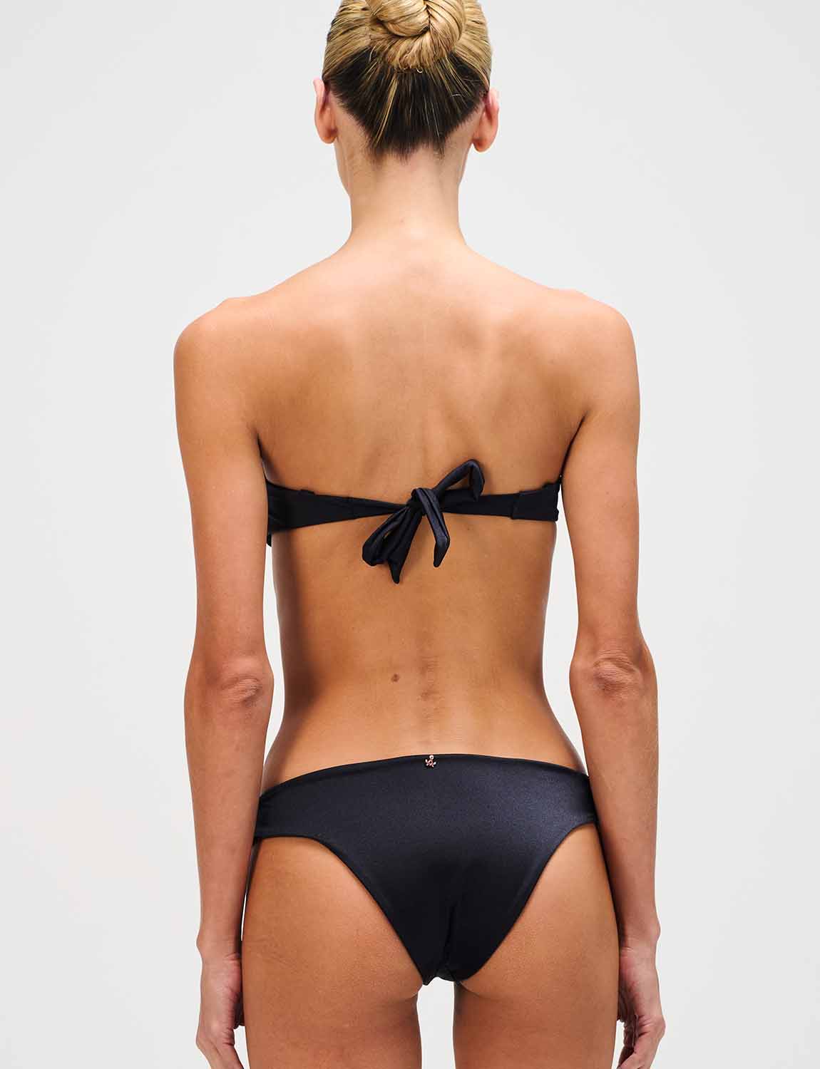 Top de copa fija con la icónica silueta ANCORA, confeccionado en tela satinada y con detalles en corte láser aplicados sobre las copas. Cuenta con tirantes ajustables y removibles, y espalda ajustable.