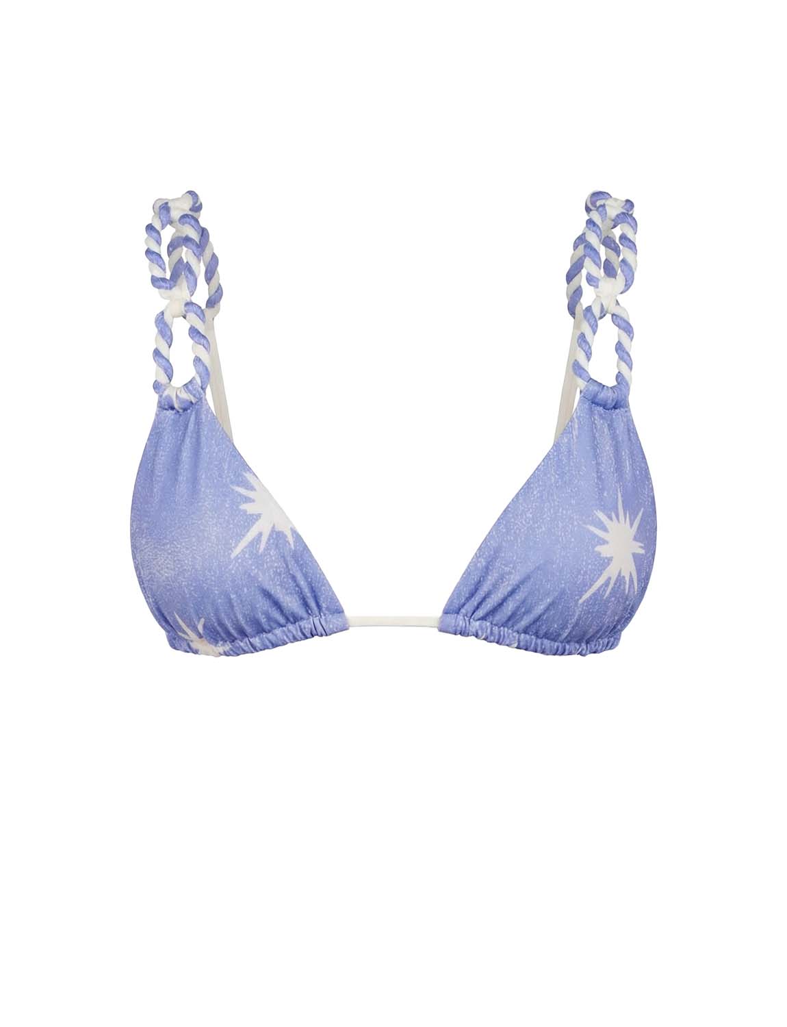 Top triangular con delicadas tiras trenzadas a mano que forman óvalos, ajustables mediante tensores con acabado en baño de oro. Espalda graduable con terminación decorativa laminada.